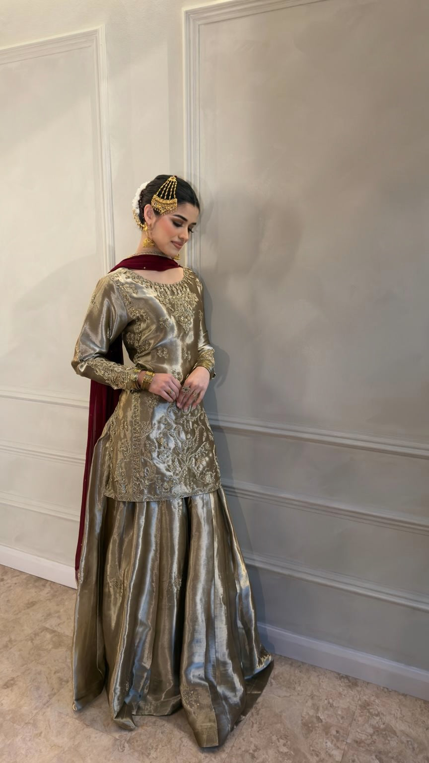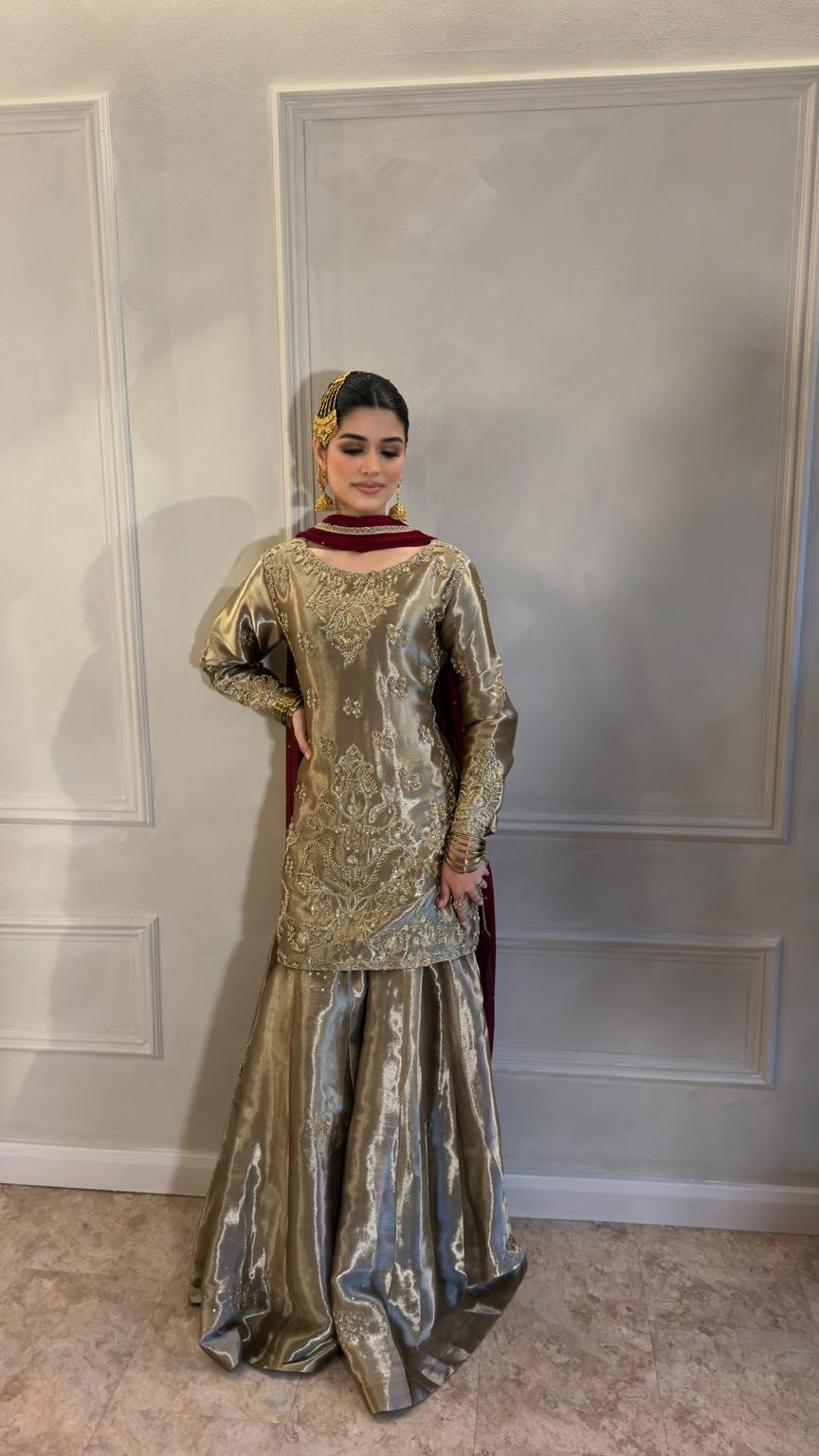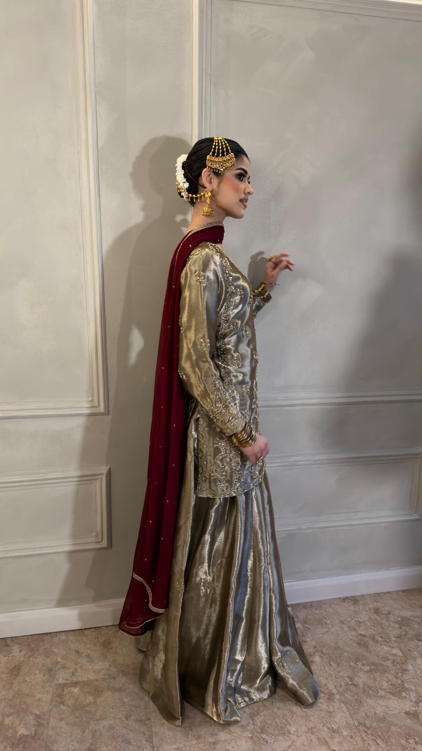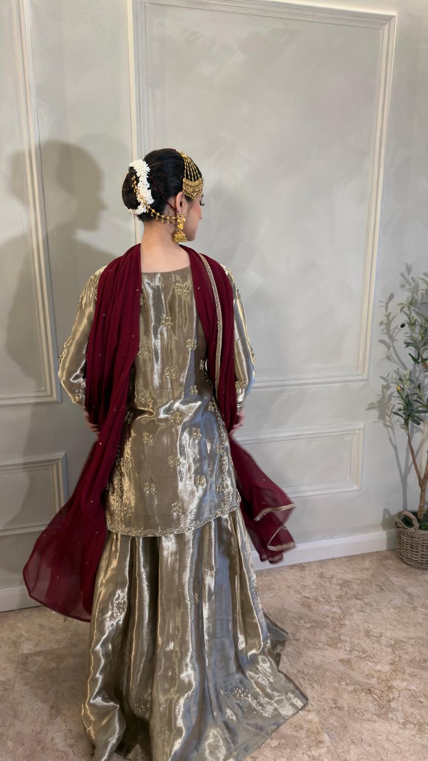 Paired with a flowing Sharara skirt that adds graceful movement and depth, the look is completed with a contrasting deep-toned chiffon dupatta that enhances the ensemble’s regal appeal. Designed for weddings, formal celebrations, and festive occasions, this outfit offers sophistication with a modern edge.