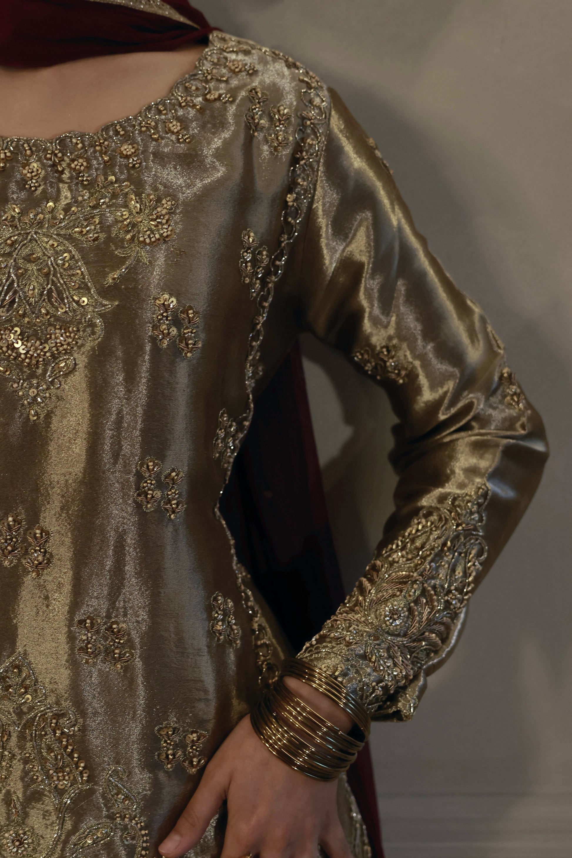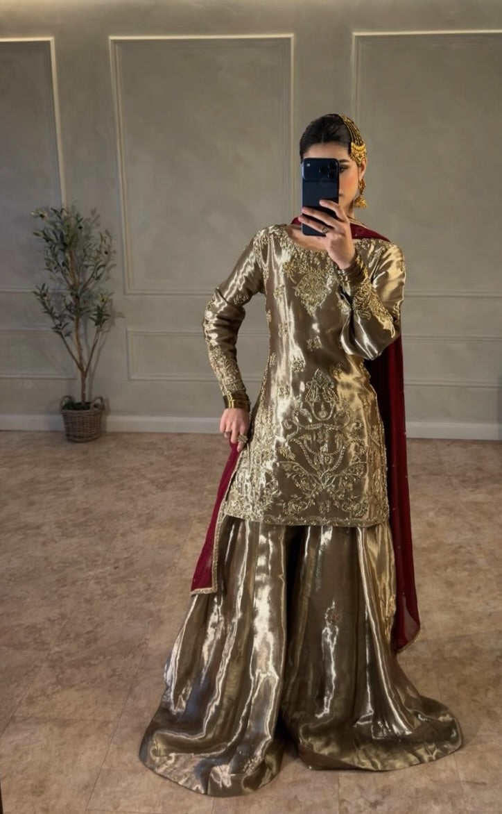 A classic silhouette elevated with opulent detailing, this bronze toned formal ensemble is a refined expression of timeless elegance. Crafted from a lustrous tissue fabric, the straight-cut kameez features intricate hand embroidery across the neckline, bodice, sleeves, and hem, creating a richly detailed yet balanced aesthetic.