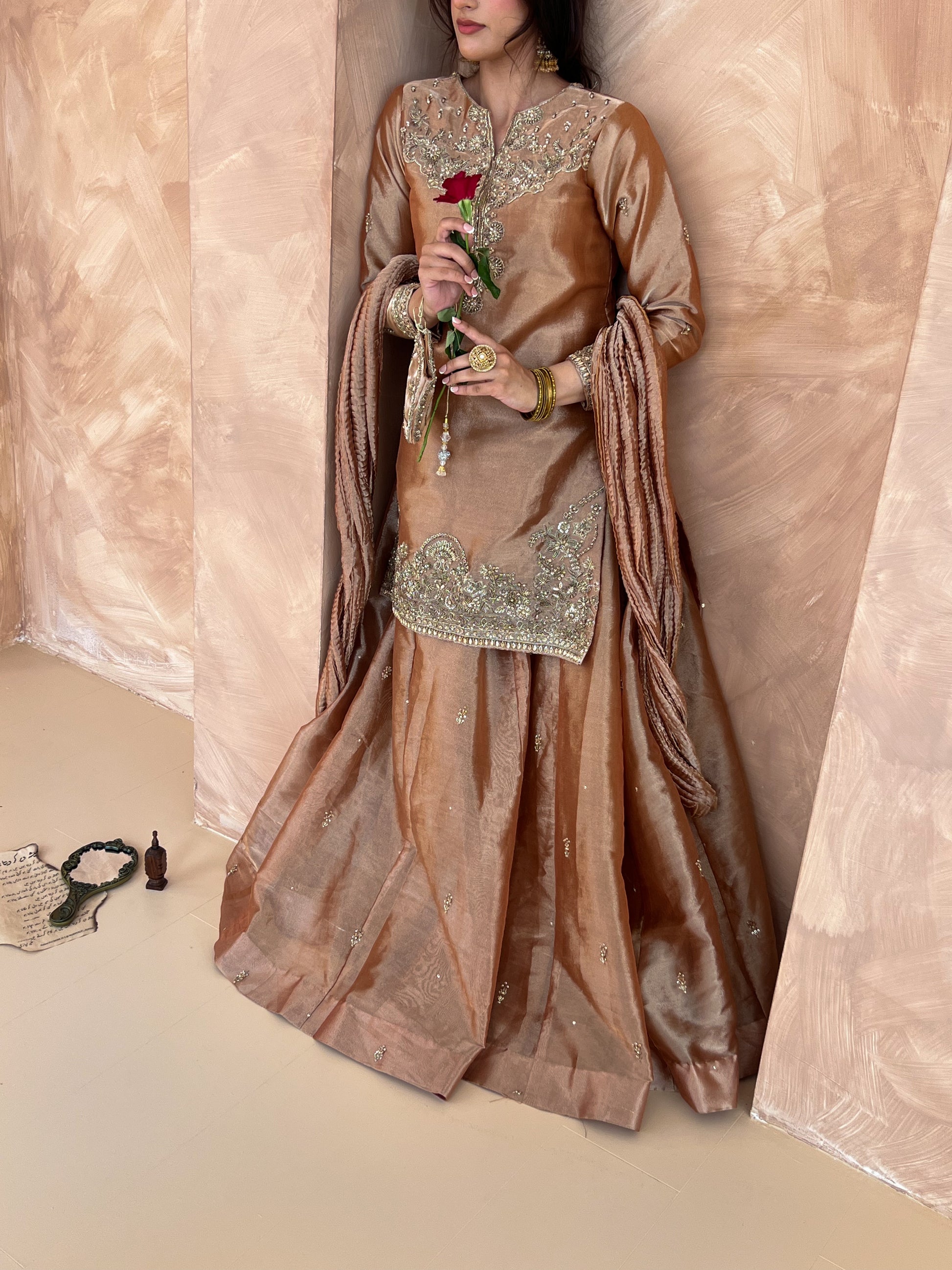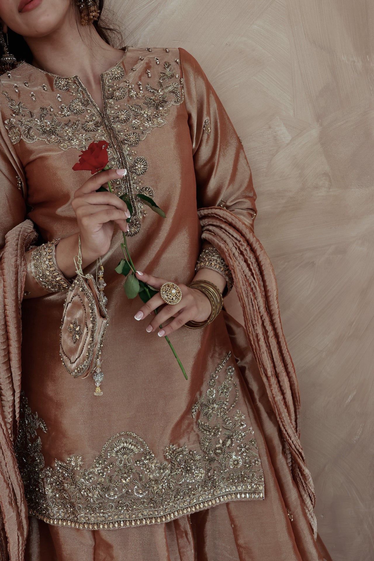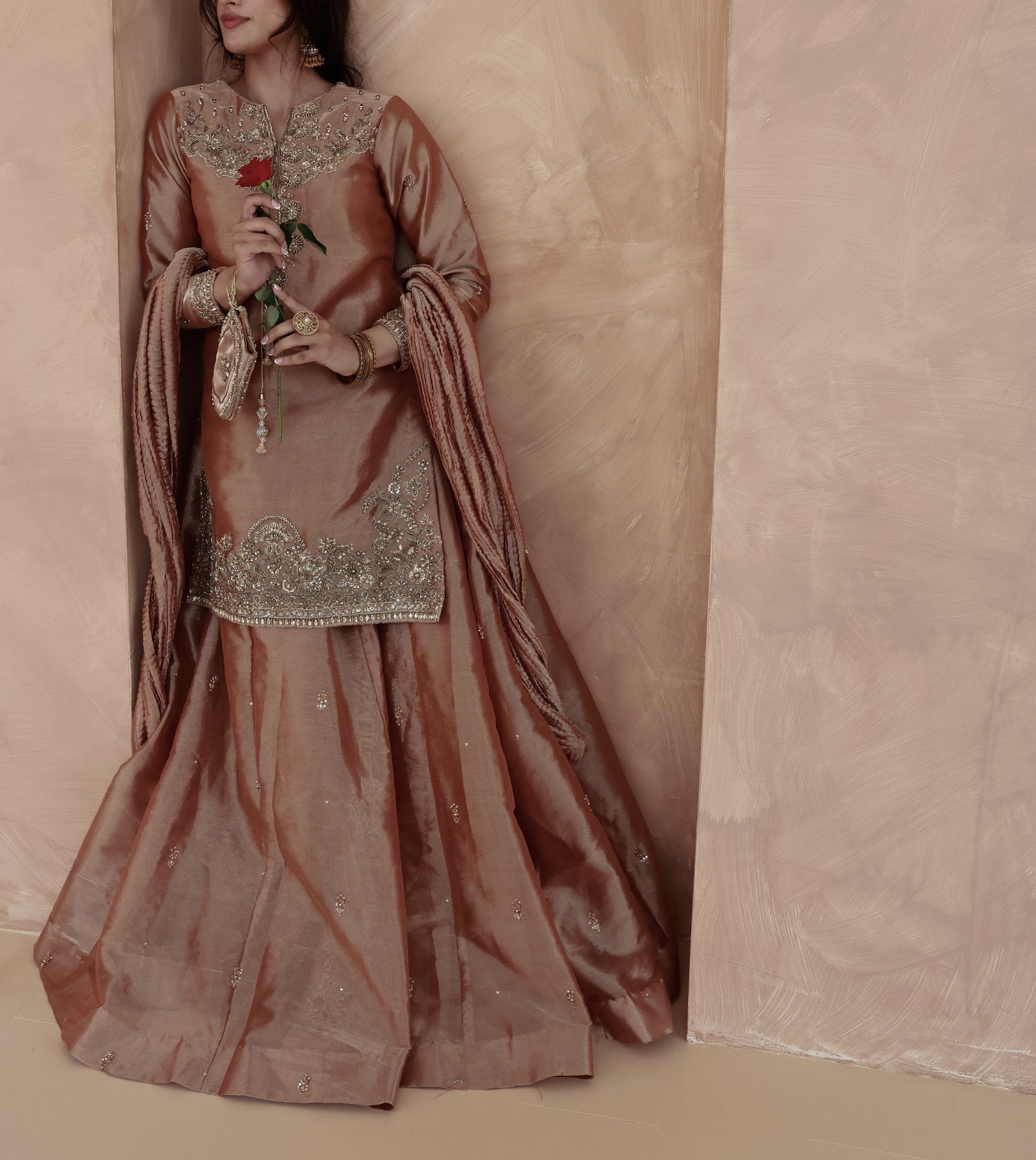 Elevate your festive wardrobe with Zara, a luxe three-piece formal wear ensemble in a stunning copper rust hue. The short tissue kameez is delicately adorned with antique embellishments, combining classic South Asian craftsmanship with a modern silhouette.