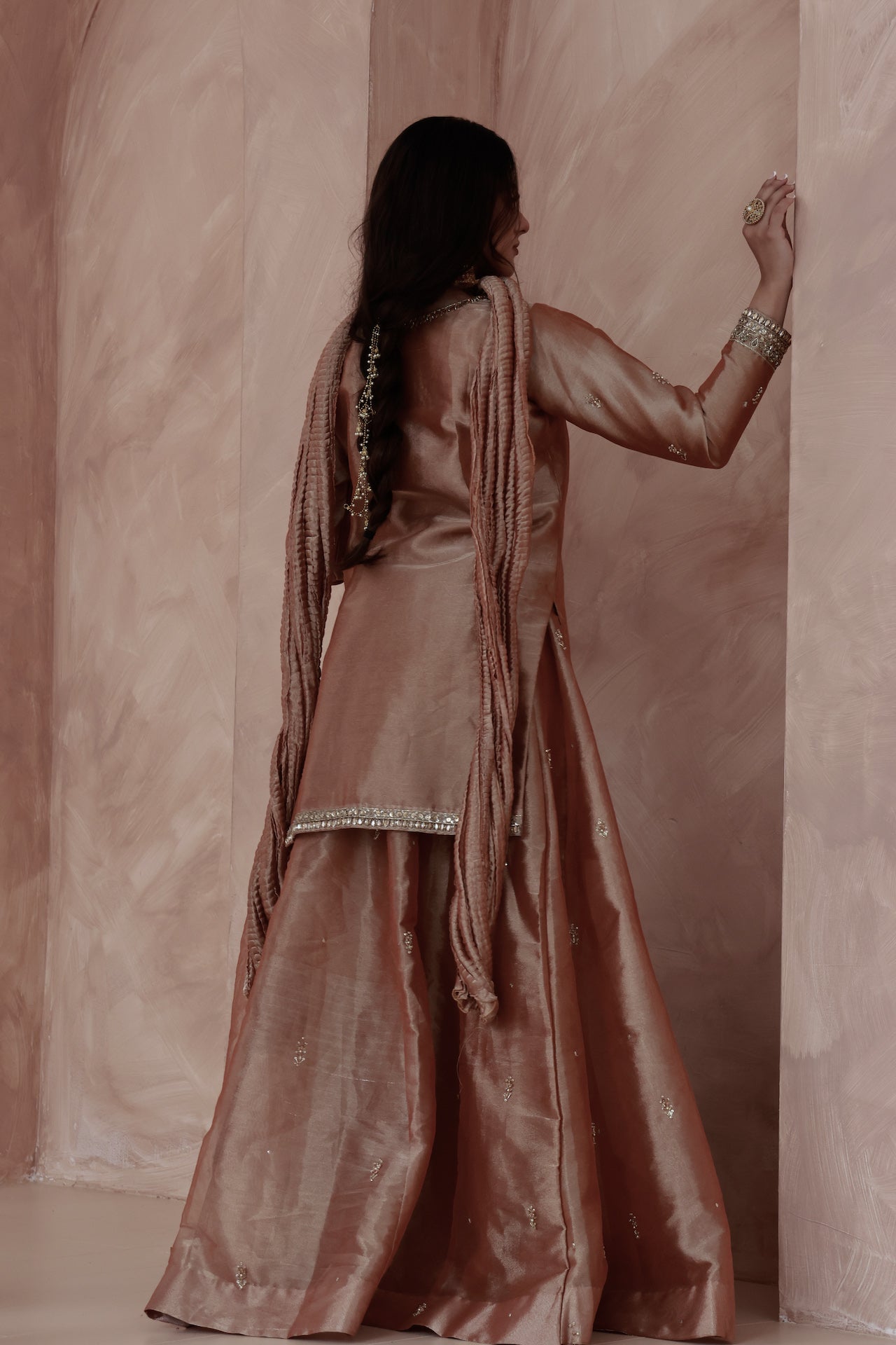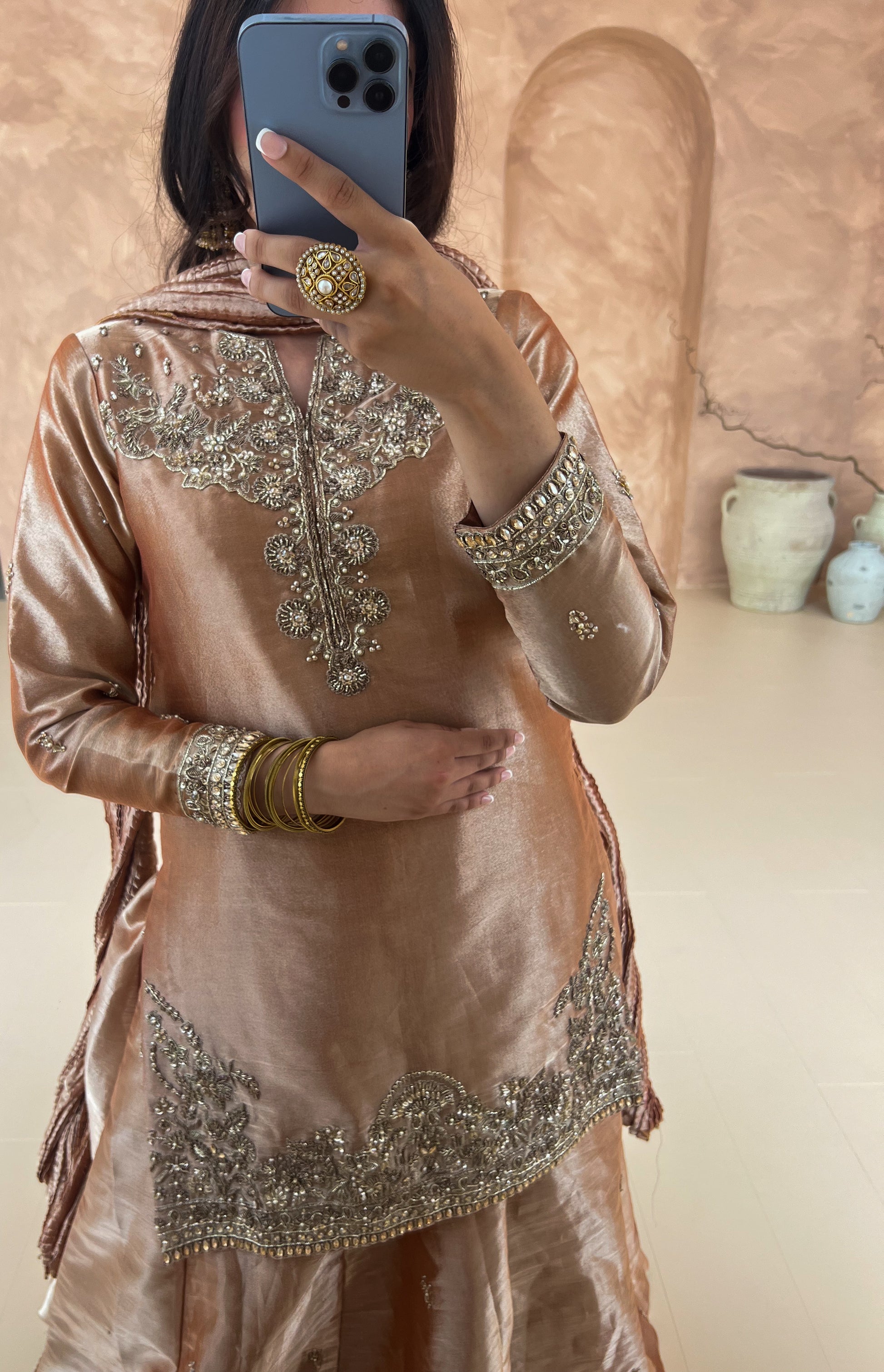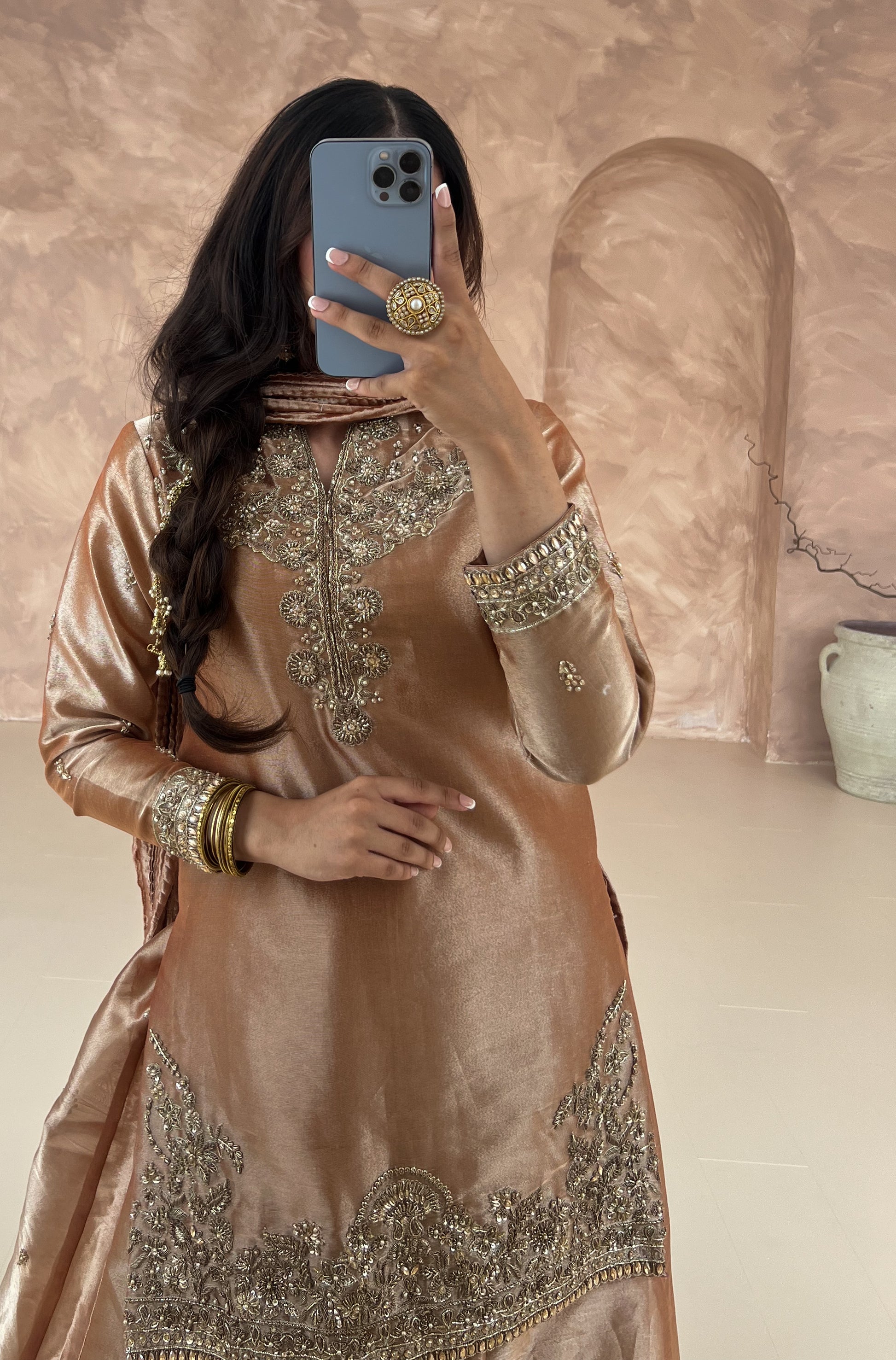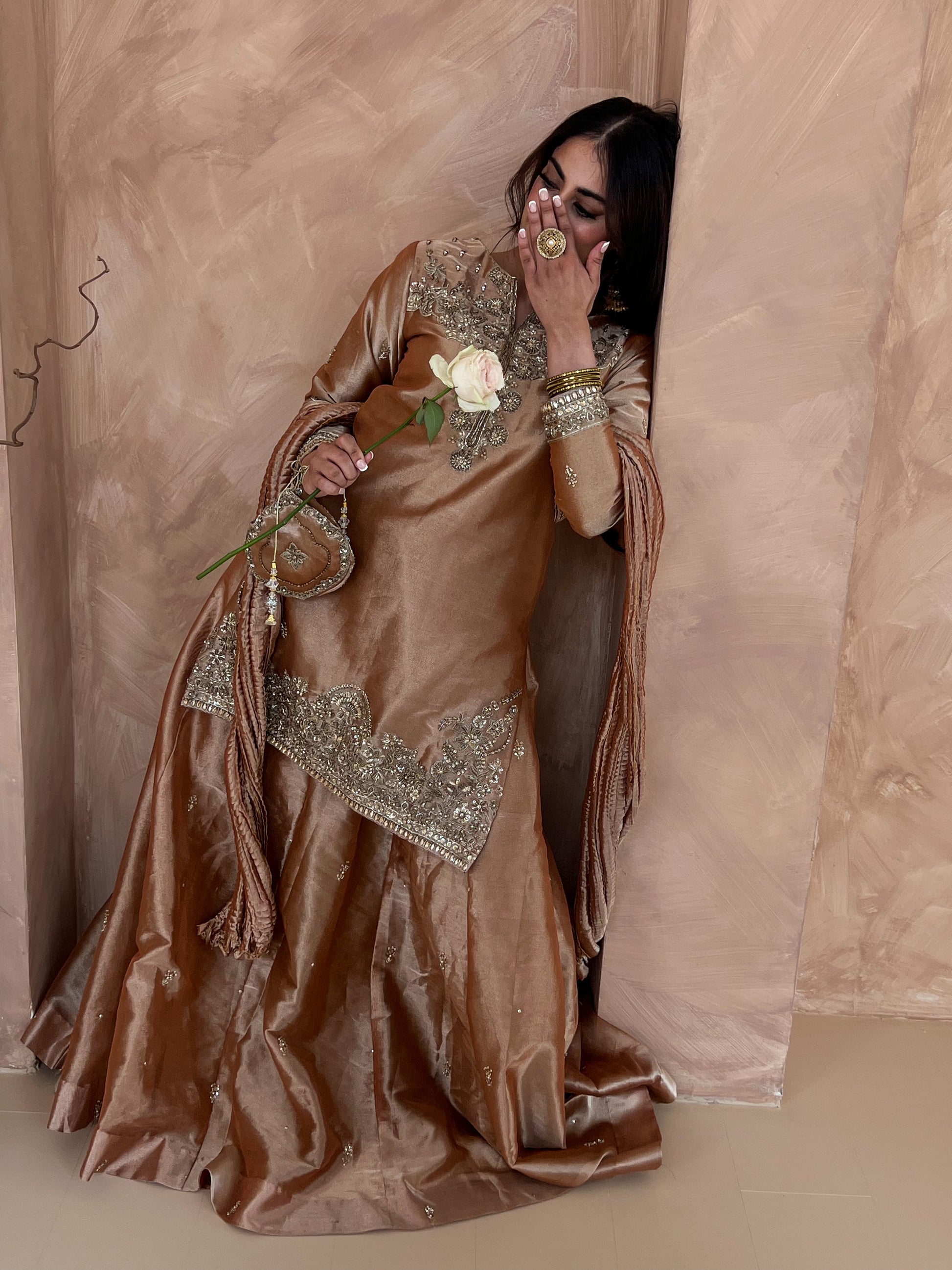 Elevate your festive wardrobe with Zara, a luxe three-piece formal wear ensemble in a stunning copper rust hue. The short tissue kameez is delicately adorned with antique embellishments, combining classic South Asian craftsmanship with a modern silhouette.