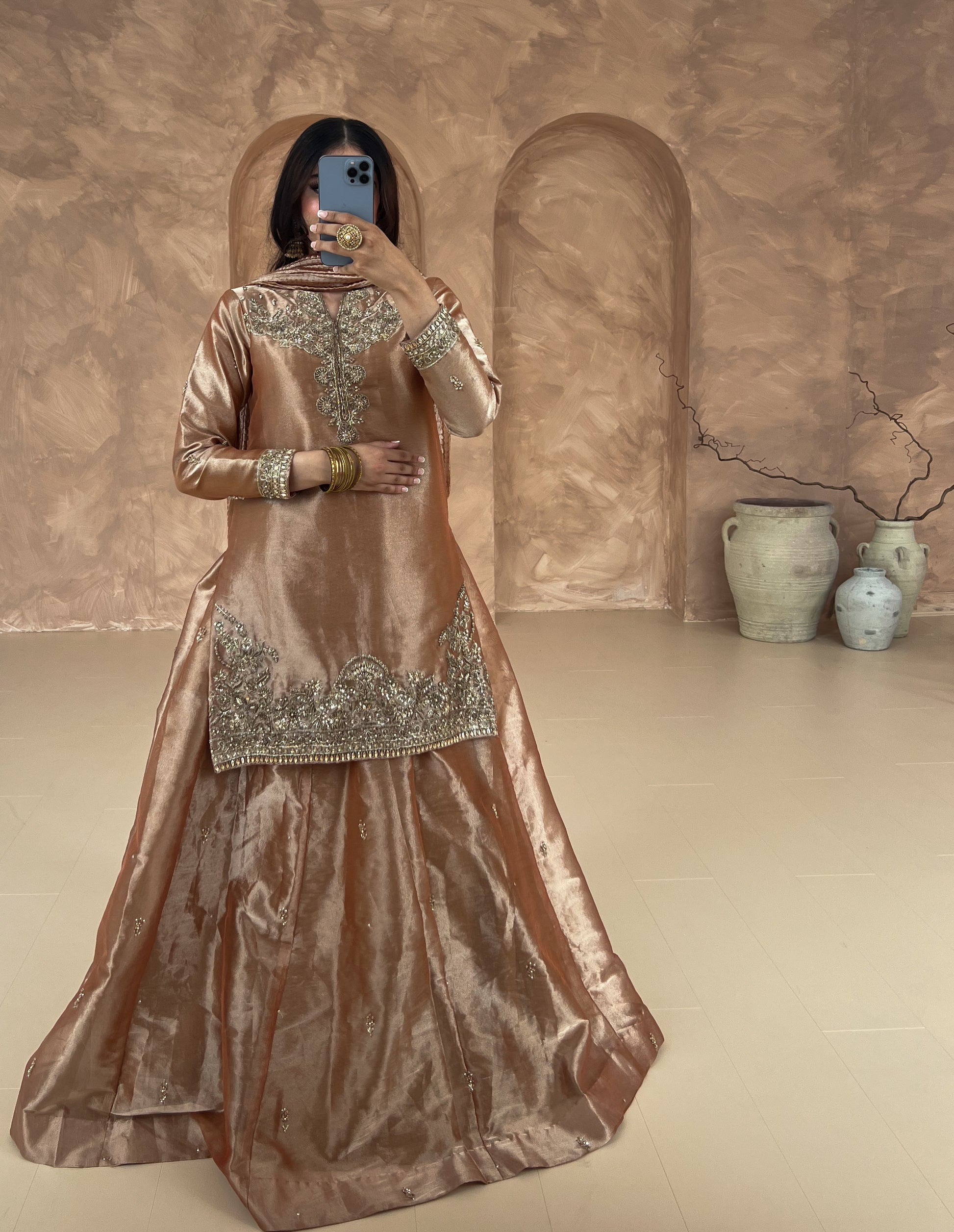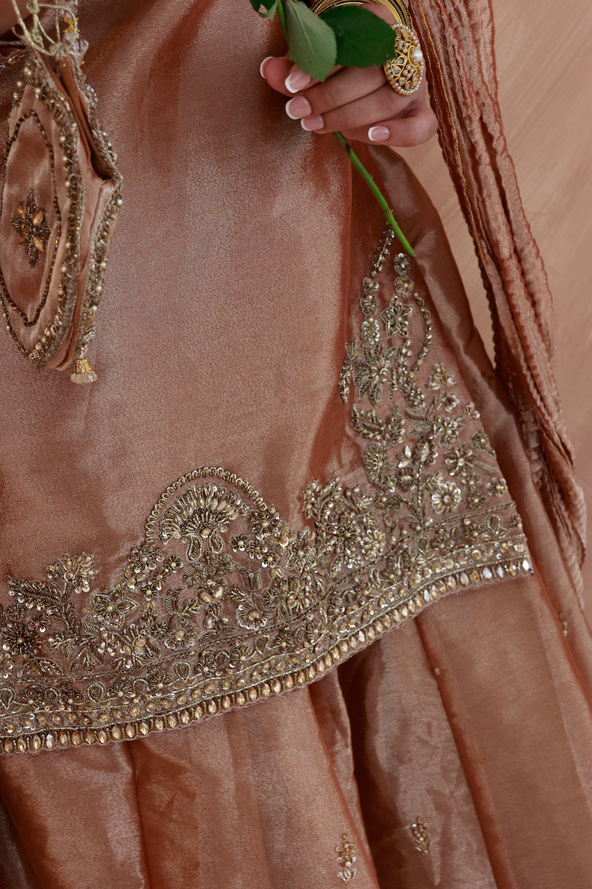Paired with a flared paneled copper tissue skirt featuring subtle motif scatter. The look is finished with a crushed tissue dupatta, adding soft texture and effortless elegance.Ideal for weddings, festive dinners, and formal events, Zara is a versatile statement that balances tradition with refined glamour.