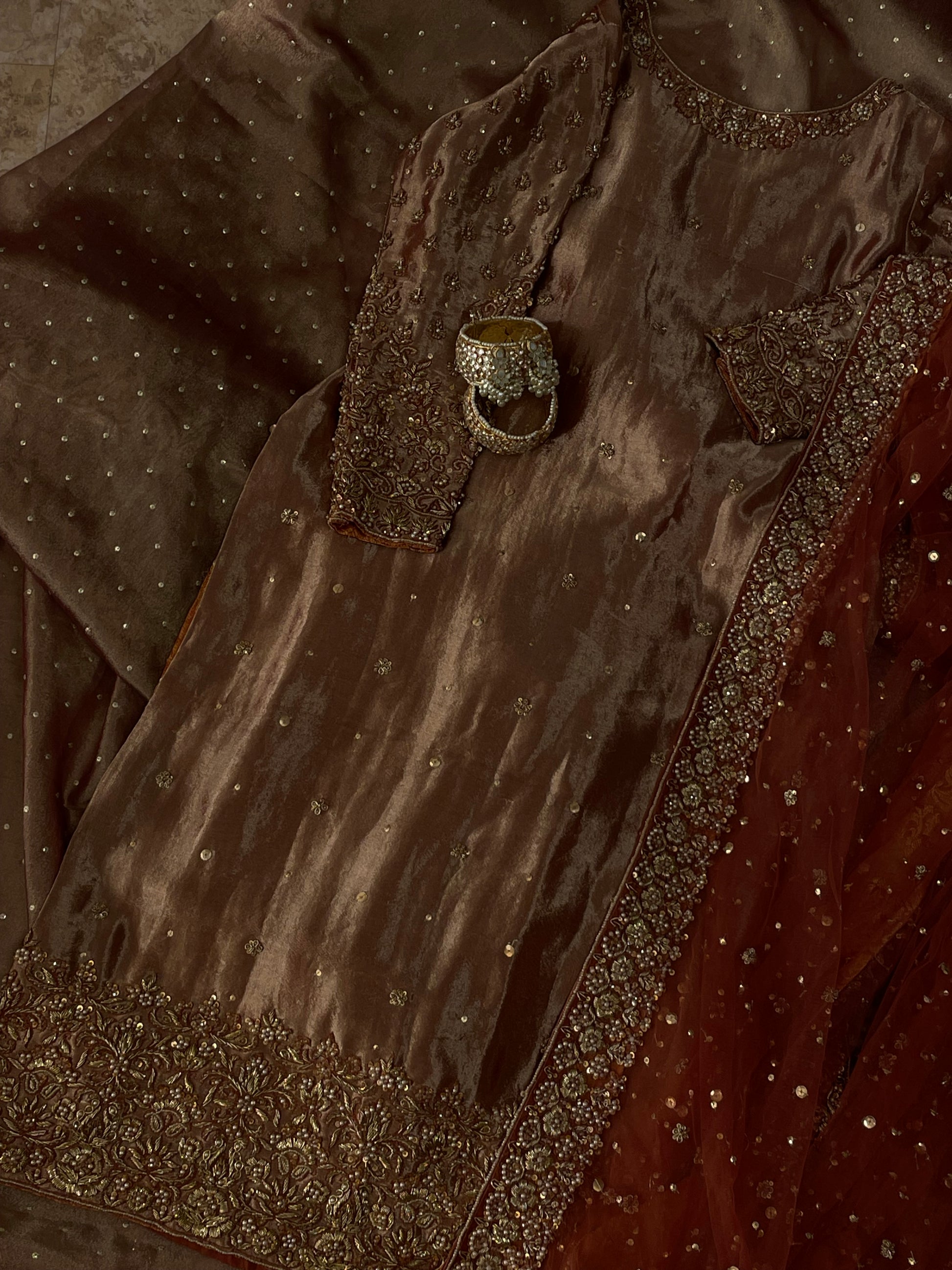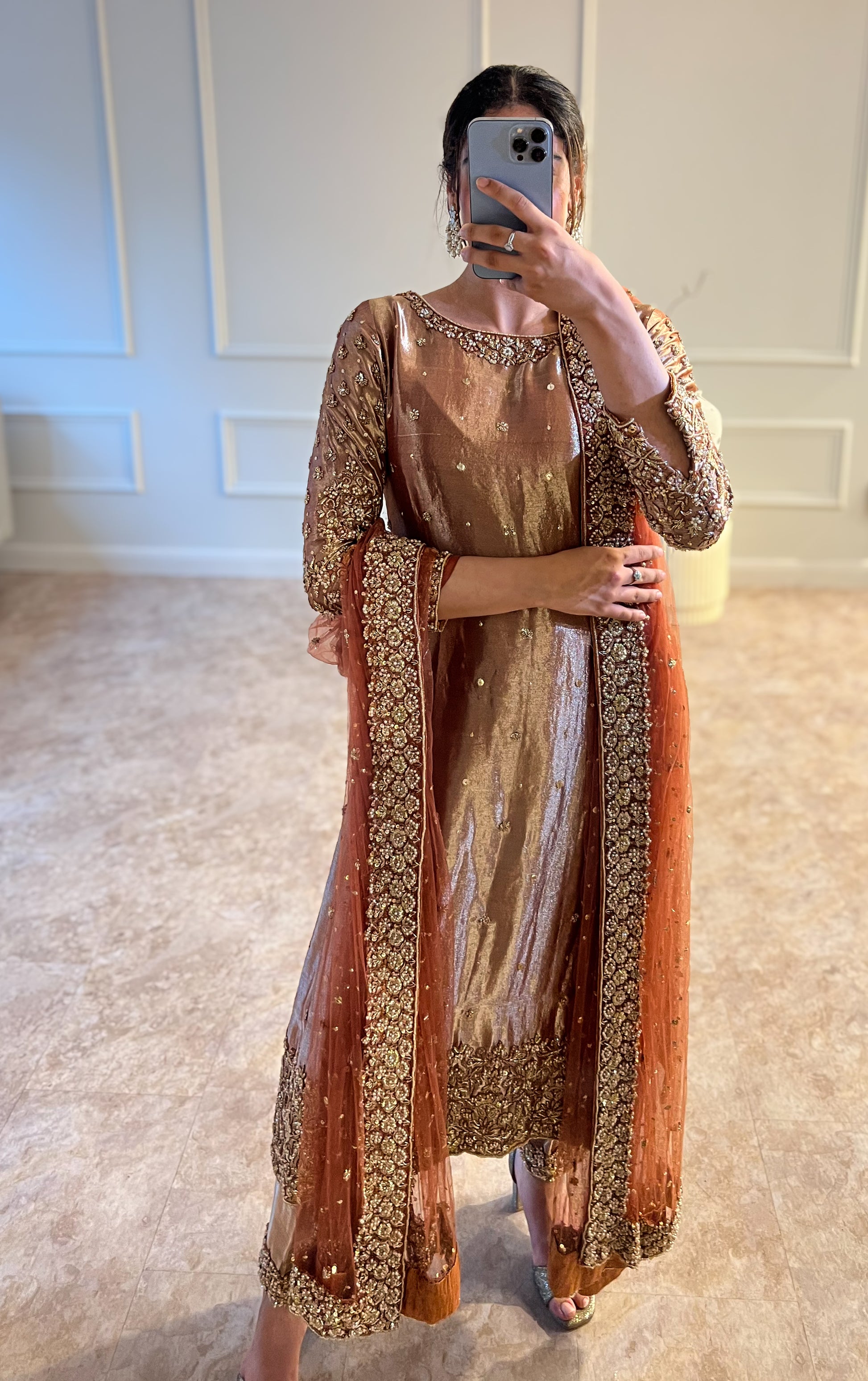 Copper rust tissue silk straight kameez with heavily hand-embroidered daaman, paired with a net dupatta featuring a single front only heavily embellished border and straight tissue trousers with hand embellishment.